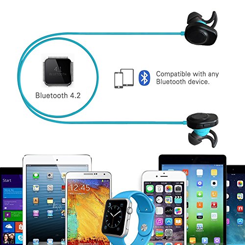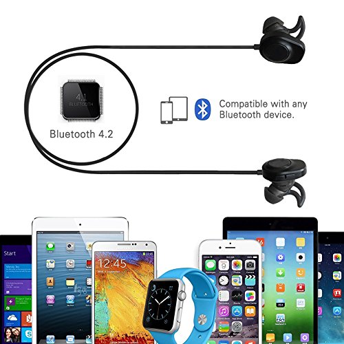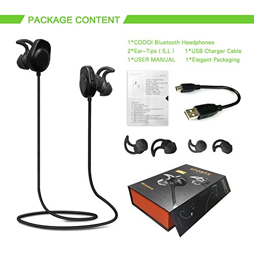 -. Feature : Comfortable and Secure Design: COOQI bluetooth headphones included S/M/L custom comfortable silicone eartips ensure a comfortable and secure fit for everyone. Sweatproof, portable and lightweight wireless earbuds can be stay in your ears comfortably / BlUETOOTH 4.2 HEADSET: Compatible with IOS iPhone or Android smartphones, connect High-fidelity stereo music and clear speech within 10 meters / NOISE ISOLATION DESIGN: Two models robust ear sleeves in various sizes ensure best custom fit and noise isolation for casual use and sports / Up to 100 HOURS STANDBY TIME: Up to 6 hours talk/play time with ultra-long standby time (full charge in just 1-2 hour); Voice Prompt function enables you to know using status right now; easily accessible on-ear controls let you control music and calls with ease; Support power synchronization / COOQI Earphones can compatible with: Apple iPhone, iPod and iPad, Samsung Galaxy Smartphone and Tablet, LG Smartphone and Tablet Nokia Lumia Smartphone and Tablet Google Nexus Smartphone and Tablet Motorola Moto Smartphone and Tablet and many more devices