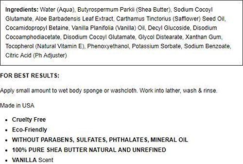 Body Wash with Pure Unrefined Shea Butter Gentle and Creamy. Helps protect from premature aging softens fine lines and wrinkles.