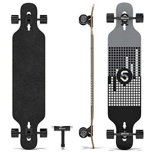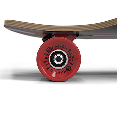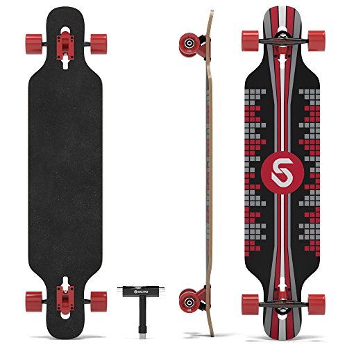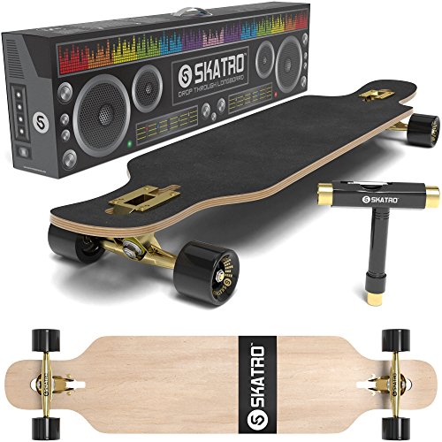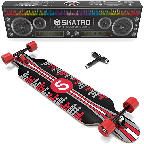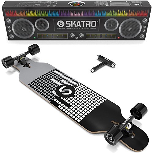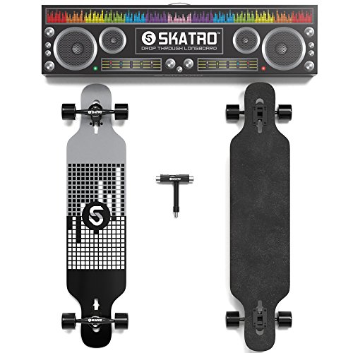 -. Brand : Skatro -. Feature : DECK - 41" perfectly sized drop down drop deck made of high grade 8 Multi-ply Hardwood maple, complete with high quality grip tape. / PERFORMANCE - Skatro Ulimate ABEC 9 bearings; Aluminum pro trucks; 70*51mm / 78A wheels for extrodinary speed and smooth freerides! / SKATRO Adhesive technology - A proP.R.Ietary adhesive technology that not only moulds all 8 wooden layers together, but also acts as structural reinforcement itself. This thin layer of structural reinforcement makes skatro boards comparable to 10 layer boards in strength, while still having the flex and agility seen in 8 layer boards. This technology is exclusive to Skatro / DESIGN - Stand out and be unique with our cool retro style designed longboards - only from Skatro! / FREE T-TOOL - Carry it during your mountain/downhill rides or even street cruising. This is a $10 value. -. IsAutographed : 0 -. IsMemorabilia : 0 -. Label : Skatro -. Manufacturer : Skatro -. ProductGroup : Sports -. ProductTypeName : OUTDOOR_RECREATION_PRODUCT -. Publisher : Skatro -. Studio : Skatro -. Title : SKATRO Drop Through Longboard Skateboard Freeride - Includes T-tool