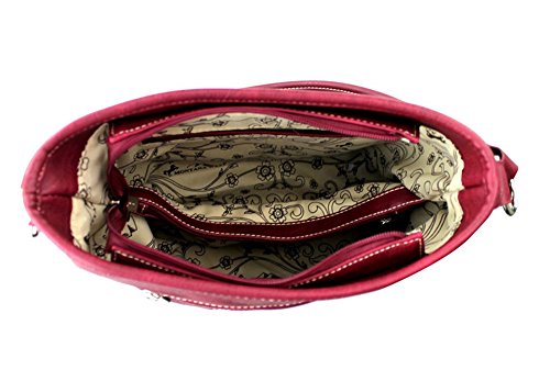 Purse is spacious and designed to keep you organized; single compartment fabric lined interior divided with a medium zippered pocket, front wall that has 2 open pouch pockets and a zippered wall pocket on inside rear