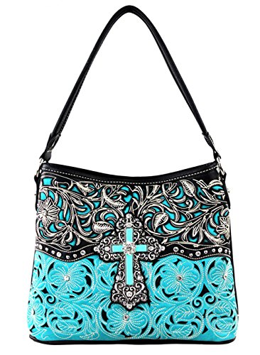 Montana West western handbag ; made of black imitation/PU leather embellished with crystals, silvertone studs, cut-out and embroidered floral pattern and large cross medallion on the front