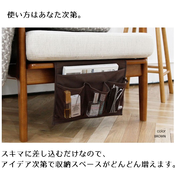 これは便利!リモコン、眼鏡、スマホなどの小物から、読書した本やA4の雑誌まで。小物が収納できます。ポケットには大サイズを1つと、メッシュ素材の小ポケット3つ。大サイズにはA4サイズのものが収納でき、雑誌や新聞、タブレットなども収納できます。小サイズはメッシュなので中身が一目で分かり、リモコンや文房具などの小物を綺麗に収納が可能。※差し込み式なので、机などで使用する場合は、上に書籍などを置いてご利用ください。※輸入品につき、パッケージは英語とハングルの表記となります。