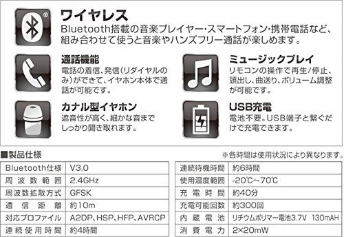 -. Feature : Bluetooth仕様:V3.0 / 通信距離:約10m / 連続使用時間:約4時間 / サイズ:6×1.4×1.5㎝(リモコン)、約55㎝(イヤホンコード)、約25㎝(充電用USBコード) / セット内容:本体×1、充電用USBコード×1、取扱説明書×1