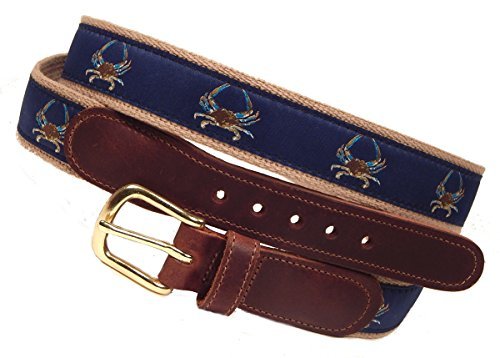 Product Description Ribbon has a repeating pattern of a Maryland blue crab, on a navy blue background, stitched into a 1 1/4 inch wide, khaki, cotton web backing. Leather tabs and a Brass buckle. Sizing Information: Select belt size 2 inches longer than your pants waist size. When the waist is an odd size, increase the belt size by 3 inches. Made in the USA 0