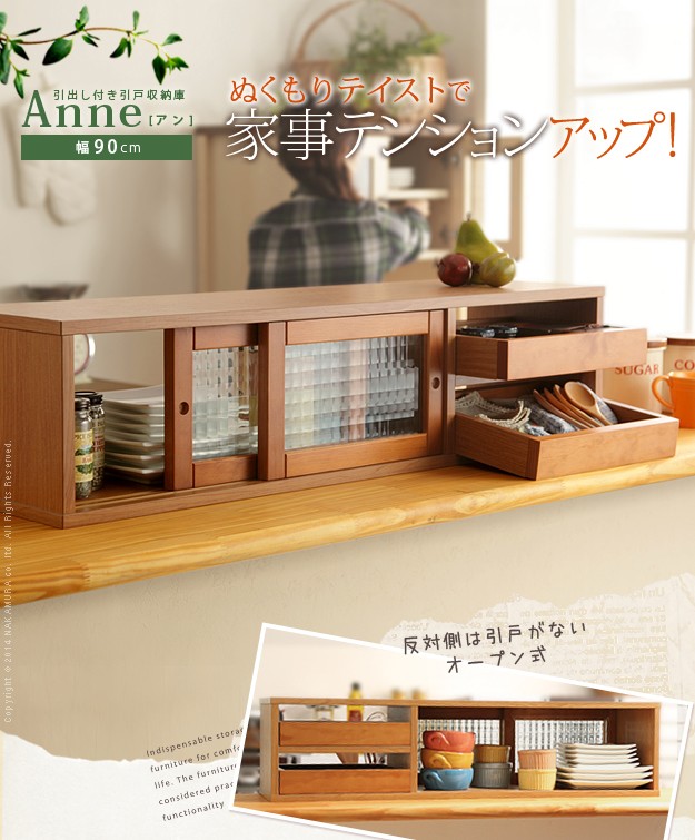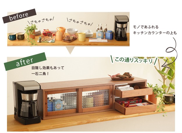 商品について:カウンター上に置いて両面から取り出し可能な引き戸収納庫。引戸は片側のみ。