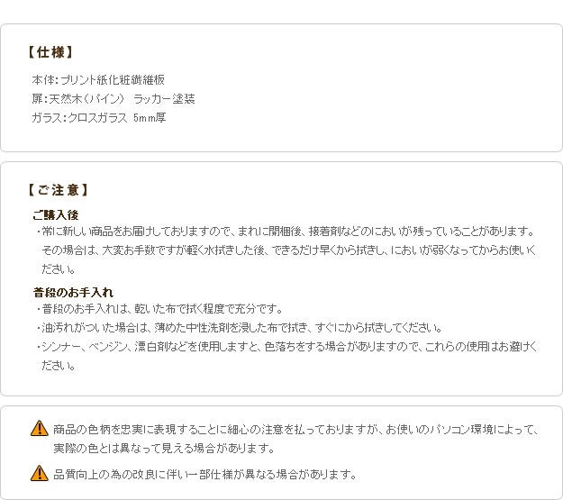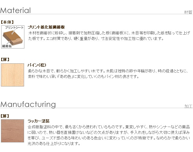 材質:天板・底板・側板-プリント紙化粧繊維板、扉枠・引出し前板-天然木(パイン)、