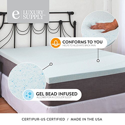-. Brand : eLuxurySupply -. Color : White -. Feature : Measures 2.5 inches thick / Density: 3.0 pounds / Open cell technology plus the infusion of gel beads into the foam increases air flow for a cool and comfortable night�s sleep / Helps rejuvenate tired muscles and eases back pain / Topper dimensions may be slightly smaller than your mattress dimensions. Size has been designed to allow you to easily secure your fitted sheet over your new topper. -. Label : ExceptionalSheets -. Manufacturer : ExceptionalSheets -. MPN : GelMemFoamTopper-P -. PackageQuantity : 1 -. PartNumber : GelMemFoamTopper-P -. ProductGroup : Furniture -. ProductTypeName : HOME_FURNITURE_AND_DECOR -. Publisher : ExceptionalSheets -. Size : Parent -. Studio : ExceptionalSheets -. Title : Gel Memory Foam Topper 2.5 inch Cooling Gel Infused Memory Foam by ExceptionalSheets - Made in the USA