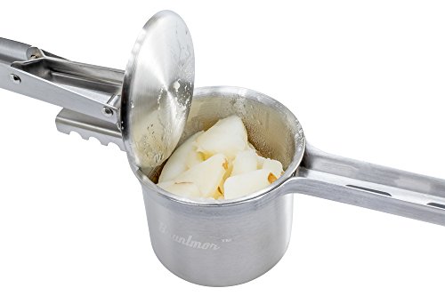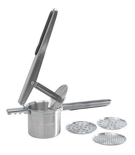 Studio : Bruntmor Publisher : Bruntmor Product Description Designed for Functionality and Comfort ? Three (3) interchangeable blades (Diameter 3-1/8") for diverse functionality, Includes a coarse, medium and fine blade ? Soft Silicone Comfort Grip Handle and Knob for added comfort ? Larger basket allows for time saving and easier use ? Longer handle improves leverage and ergonomics ? 100% Stainless Steel so that you have a potato ricer that will last a lifetime - no flaking, rusting or BPA in your food. Convenience ? Non-slip silicone handle and knob hold ricer over pots and bowls ? Hanging hole in knob ? Hassle free cleaning - just run under the faucet or place in the dishwasher. Long, Ergonomic handles that give you enough leverage to press potatoes efficiently to make pressing a fun and easy exercise. Contains ? Bruntmor Kitchenware Ricer with Comfort Grip Handles ? Three (3) Interchangeable Blades 0