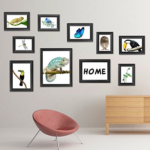 -. Feature : Material: made of high qualtiy MDF Wood,very sturdy and durable / Design: 10 pieces independent picture frames,holds 1-8"x10", 2-5"x7", 4-4"x6", 3-3.5"x5" images seperately,7 of them can be hung on the wall, 3 of them can only be put on table / Function: used at home, office or gallery to preserve and showcase family photos or wall art / Usage: Load your favorable photos easily with removable back panel / Feature: Ready to hang on your wall with built in hanging hardware.
