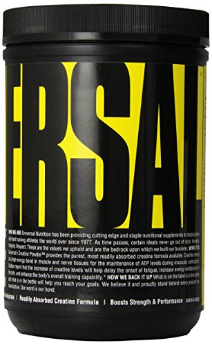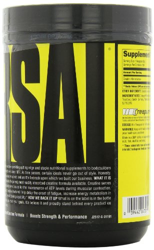 Studies report that the increase of creatine levels will help delay the onset of fatigue, increase energy metabolism in the cells, and enhance the body’s overall training capability. Plus the power provided by creatine is unmatched in its ability to help your muscles work harder and longer-including buffering lactic acid build up during training. Each serving of Universal’s Creatine Powder provides 5000mg of pure creatine suspended in its purest state for maximum absorption and bio-availability.