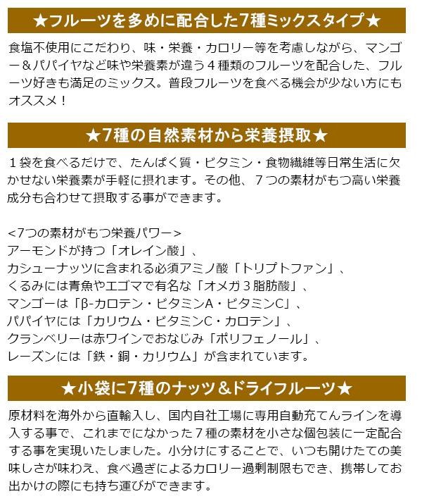 人気のナッツ&ドライフルーツ小袋ミックスシリーズに、マンゴー&パパイヤを加えて4種のフルーツを配合したフルーツ多めの7種ミックスタイプ!! |