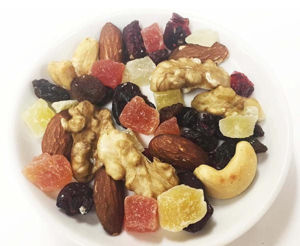 | 原材料 | 名称:ナッツ&ドライフルーツ混合食品 アーモンド(アメリカ)、くるみ(アメリカ)、カシューナッツ(インド)、乾燥クランベリー(クランベリー(チリ、アメリカ)、砂糖、植物油脂)、レーズン(レーズン(アメリカ)、植物油脂)、乾燥マンゴー(マンゴー(タイ)、砂糖)、乾燥パパイヤ(パパイヤ(タイ)、砂糖)/クエン酸、保存料(メタ重亜硫酸ナトリウム) |