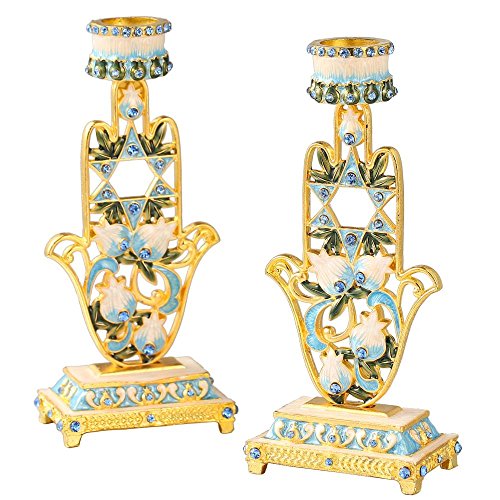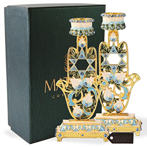 Shabbat Inspired Design – These candlesticks feature a Hamsa shape and the Star of David with high quality Matashi crystals, surrounded by beautifully intricate details atop a stunning base for a classic style.