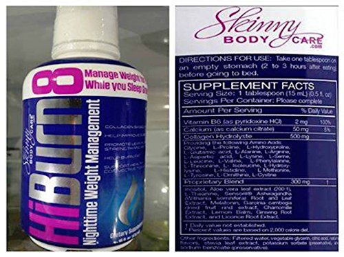 -. Binding : Health and Beauty -. Brand : Dr Skinny -. Color : Pink -. EAN : 0694263712710 -. Feature : Promotes and Improves Healthy Sleep, Sleep Aid, with Melatonin, Chamomile, Ginseng and Calcium / Helps Lose Weight While Sleeping and Controls Appetite, Suppresses Appetite, Boosts and Increases Metabolism, Fat Burner with Collagen and Garcinia Cambogia / Anti-aging, Weight Loss, Better Sleep with NO Fillers, Hormones, Acids and Antibiotics / Aids the Body's Natural Restorative Process, Liver Function, Detox, Improves Digestion, Skin and Makes You Look Younger with Aloe Vera Leaf and Lemon Balm / Promote Lean Muscle Strength and Recovery. Reduces Stress, Relaxes and Supports Connective Tissue with Sensoril and Inositol -. IsAdultProduct : 0 -. Label : Skinny Body Care -. LegalDisclaimer : These statements have not been evaluated by the Food and Drug Administration (FDA). These products are not meant to diagnose' treat or cure any disease or medical condition. Please consult your doctor before starting any exercise or nutritional supplement program or before using these or any product during pregnancy or if you have a serious medical condition. -. Manufacturer : Skinny Body Care -. MPN : HB -. PackageQuantity : 1 -. PartNumber : HB -. ProductGroup : Health and Beauty -. ProductTypeName : HEALTH_PERSONAL_CARE -. Publisher : Skinny Body Care -. Size : 16 oz -. Studio : Skinny Body Care -. Title : HiBurn8 - Lose Weight, Sleep Better, Reduce Stress, Detox, Anti-aging, Boost Immunity - Night Time Natural Weight Loss Supplement, Appetite Suppressant - Collagen, Calcium, Garcinia Cambogia, 16oz -. UPC : 694263712710