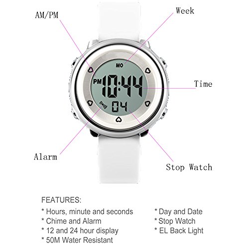 -. Feature : 6 Color Listing to Choice :White, Blue ,Purple,Green,Black,Rose Red / High quality movement and rubber band / Alarm clock, timer, back lighting, calendar, 12H/24H time function, 4 seconds EL backlight,50-day automatic memory storage step function,up to 23hr.59min / 5ATM Water Resistant for Swimming (Note: Do not Operate The Buttons When The Watch in Water) / Heart rate mode: Touch sensor to measure pulse, watch will show dynamic heart rate 30-200 indicated with changing animation