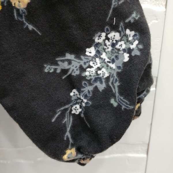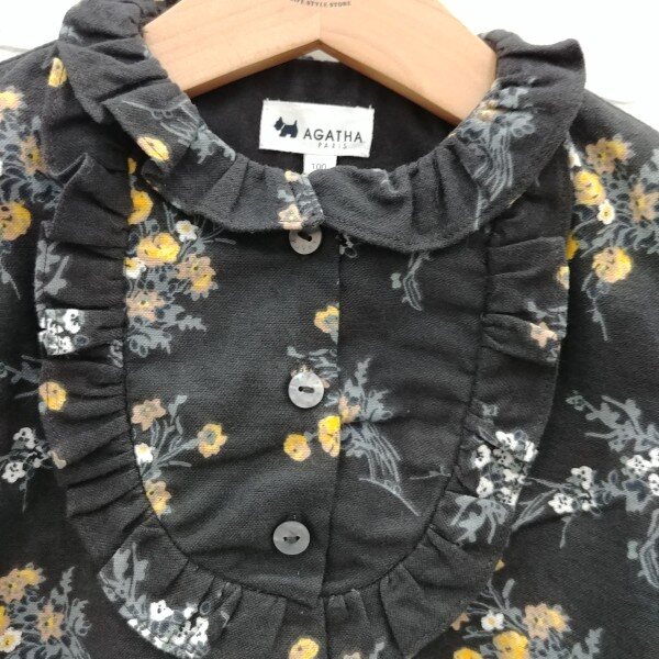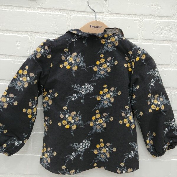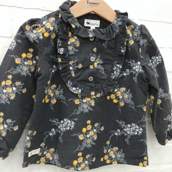플라워 패턴의 기모원단을 사용한 블라우스. 프릴카라와 라운드 프릴로 사랑스러운 느낌을 주는 스타일.