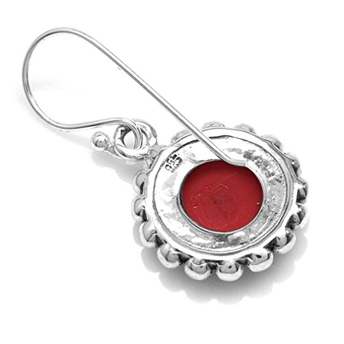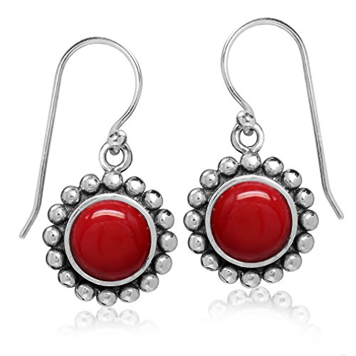 8MM Created Red Coral 925 Sterling Silver Bali/Balinese Style Dangle Hook Earrings