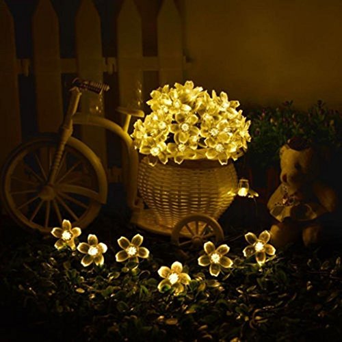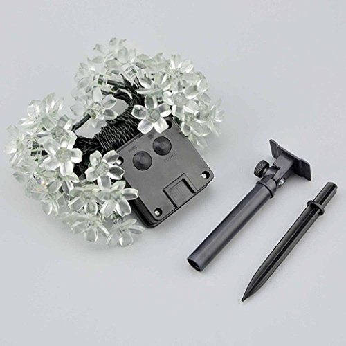 -. Feature : PERFECT PERFORMANCE:7M/22ft 50LED Cherry Blossom Flower solar string fairy light. It's a perfect gift for your friends or families,this waterproof decorative light is solar-powered,Environmental-friendly,high energy conversion rate,saving you much electricity. / TWO Switch Buttons: One is 2 Mode (steady on, flashing), the other one is Power On/Off (After switch turned on, can automatic light control and charging).Long working time,steady on mode 6-10h; flash mode 8-10h at night ,solar panel must absorbs enough sunshine during day. Note:fully charged 4-6h in the summer;fully charged 8-10h in the winter). / EASY TO INSTALL: No wiring required, no battery replacement. The solar panel MUST be installed in a well-lit location where it can receive maximum sunlight during daytime hours. Any cover that shades the panel will affect its ability to absorb sunlight and decrease the amount of brightness and duration of the LED lights, Recharged by solar panel under sunlight,totally Eco-friendly product. Angle-adjustable spike for optimum sunshine exposure. / WATERPROOF DESIGN: Combine the solar panel, ground stake and bracket together,setup takes no time at all.suitable for outdoor use, no worry for rain drops.For initial application, we sest the solar panel be exposed to the sun(to fully charge the battery )for 1 day or more. / SOLAR STRING LIGHTS : Ideal for decorating your gardens, patio, lawn, porch, gate, yard, Christmas lights, wedding, party, Neon Signs, Christmas lights, wedding, party,home, outdoor, indoor,etc.Suitable for indoor and outdoor decoration with trees, wreaths, etc. Just leave it alone and no more concerns.