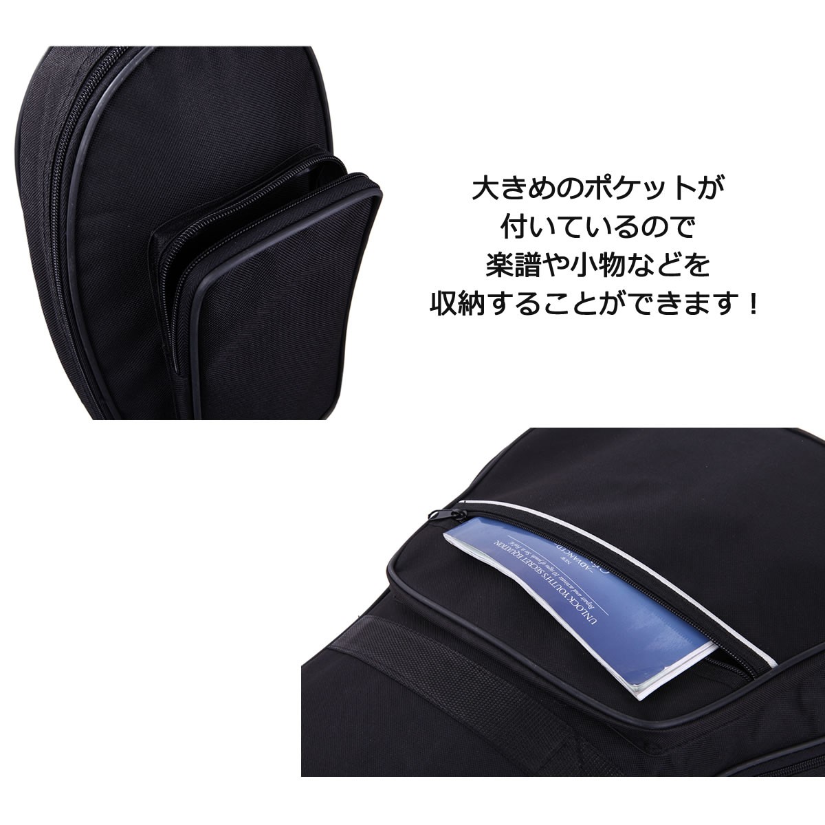 ポケットが2つあり、楽譜や小物などの収納力もバッチリ!