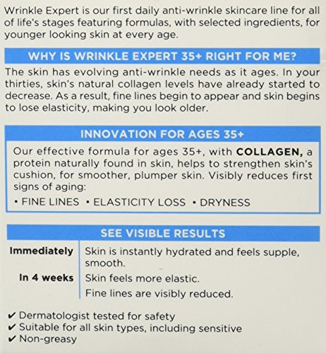 Wrinkle Expert* 35+ Collagen Moisturizer is a part of L’Oral Paris’ first daily anti-wrinkle moisturizer line, which features anti-wrinkle moisturizer formulas made for all of life’s stages. This anti-fine line cream for ages 35+ is formulated with collagen to help strengthen skin, for the appearance of smoother, plumper-looking skin. This collagen moisturizer helps visibly reduce early signs of skin aging including fine lines, loss of skin elasticity, and skin dryness. Try Wrinkle* Expert 35+ Collagen Moisturizer to help reveal and encourage plumper-looking, hydrated skin. Packaging may vary. What you receive may not be what is reflected on site. • Helps reduce the look of fine lines • Collagen face cream helps visibly reduce first signs of aging • Helps improve skin elasticity • Helps strengthen skin’s cushion Use Wrinkle Expert* 35+ collagen moisturizer every morning and night after cleansing and/or removing makeup, smooth the collagen moisturizer gently over the face and neck until thoroughly absorbed. For best results, use in conjunction with other L’Oral Paris skin care products. Dermatologist tested For safety. Suitable for all skin types, including sensitive.Feature