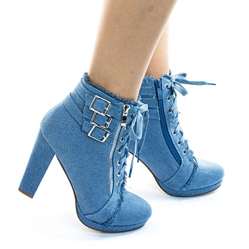 Binding : Apparel Product Description About This Shoes :These ankle boots features chunky block heel, thin platform, non functional decorative silver zipper, a working inner zipper, triple belted detail, full combat inspired lace up closure and destroyed frayed / fringe trimming. Brand - Forever Link Colors Available: Dark blue denim, light blue denim Occasion: Formal Shoe Type: Booties Shoe Style: Booties Inner Lining: synthetic Heel Height In Inches - 4.5 Heel Style - Block Toe Style - round-toe Platform Height In Inches - 0.5 Shaft Height In Inches - 4.5 Circumference Opening - n/a Strap Type - strapless Sole - manmade All Man Made Material unless otherwise stated. Computer/Phone/Table monitors might show color differently because of its quality or calibration, we suggest you look at the photo in at least 3 monitors if you need exact color match of your shoes. 0