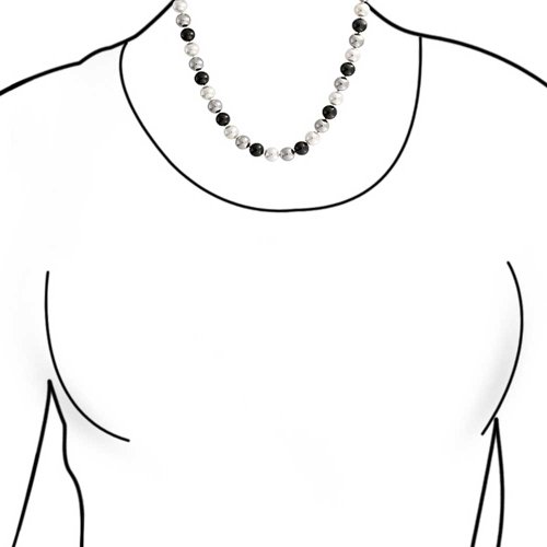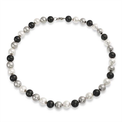 A stylish new piece of black and white jewelry will make a wonderful addition to your jewelry collection. Our newest multicolor Simulated Pearl necklace is very eye catching. It is made in a repeating pattern of alternating black, grey and white 10mm Simulated Pearls that feature a knot in between each simulated Simulated Pearl for a sensational look and great movement. A rhodium plated brass lobster claw clasp adds a secure finishing touch to the 18 inch Simulated Pearl necklace. If you are shopping for June birthstone jewelry for yourself or for a loved one, simulated Simulated Pearl necklaces make a very fashionable choice, since Simulated Pearl is the traditional birthstone for the month of June. Big Simulated Pearl necklaces also make a superb choice of bridal Simulated Pearl jewelry for any June brides you may know.Feature