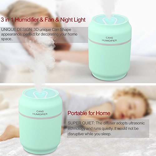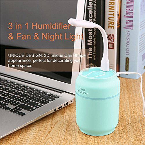 Ultrasonic Cool Mist Humidifier,Chiclits Usb Multifunctional 200ML Air Humidifier,LED Lights, Small Fans 3 in 1,For Office Home Car Kids Room (Blue)