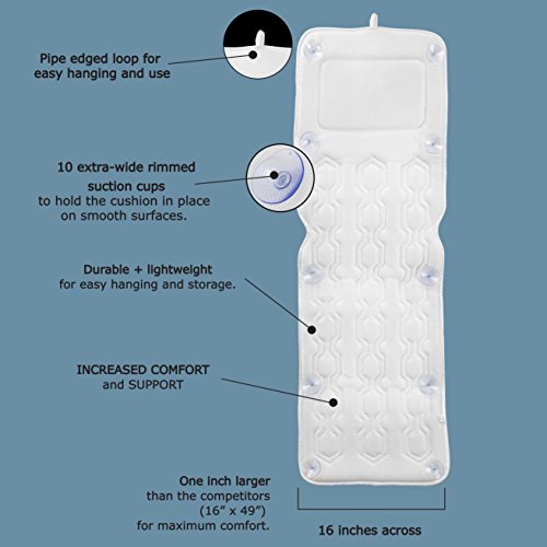 - INDULGE IN A SPA-LIKE EXPERIENCE from the comfort of your home! Immerse in relaxation and wash away all tension and stress after a hard work day with a luxurious, LARGE (16” x 49”) bath mat relieving your tense muscles! Enjoy peerless comfort in the bathtub with the ultimate full body spa pillow, staying firmly put with 10 extra wide rimmed suction cups. Unwind and feel rejuvenated and full of energy!