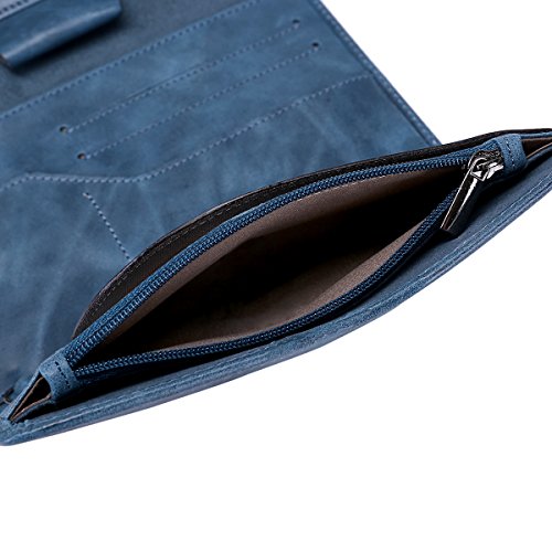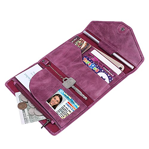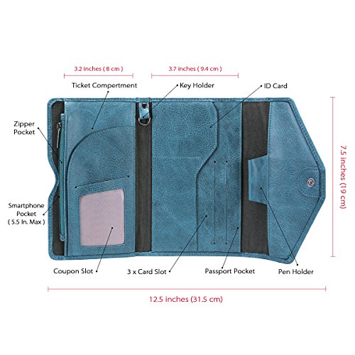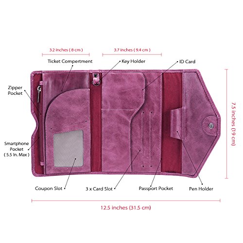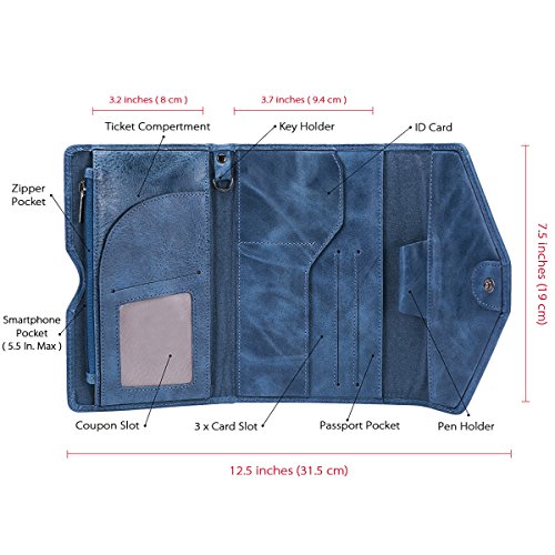 Product Specific: *Material:Top Grain Leather. *Dimensions: 6.55"L x 4.15"W x 1"H (16.8 x 10.8 x 2.8 cm) . *Safety:Includes RFID blocking technology to prevent unauthorized access to personal information *Structure: 1 Passport pouch, 3 Card slots, 1 ID Pouch, 2 ticket compartment, 1 Zip pocket, 1 Sim card slot, 1 Pen holder