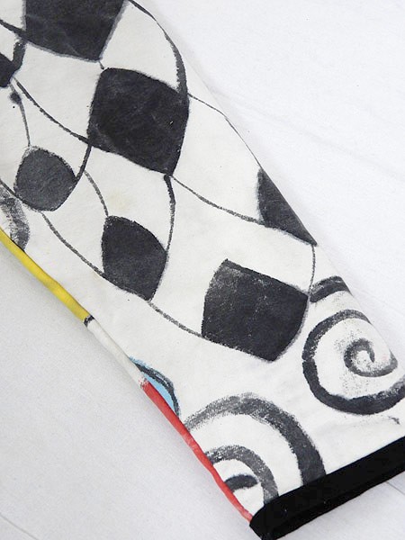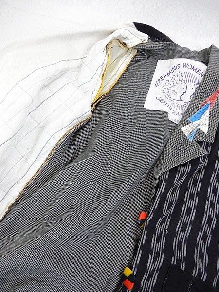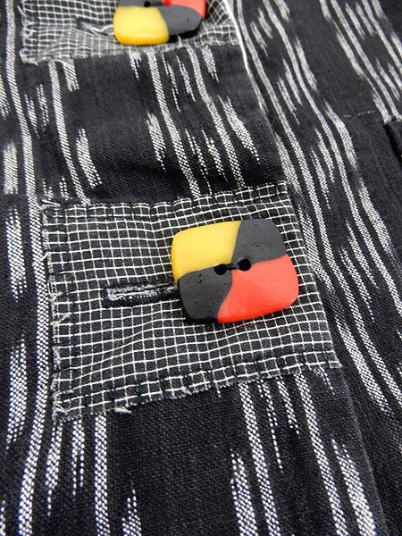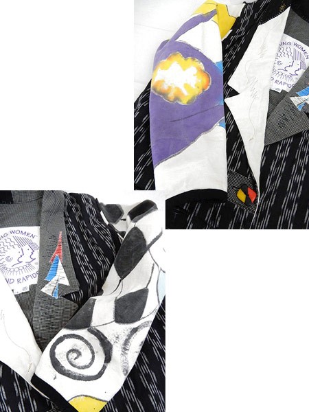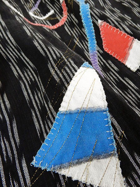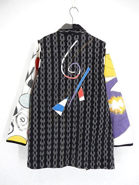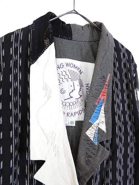 Ladies ブランド カラー黒ベース・多色 メール便不可 コンディション★★★ 素材表記はありませんが、コットンかと思われます。 表記サイズS スタッフコメント色々な生地が組み合わさった、古着ならではの面白い1点です。 ※袖等の生地に目立たないシミ汚れがあります。 実寸サイズ 着丈 82.5 cm 身幅 57 cm 肩幅 42 cm 袖丈 61.5 cm ※ウエスト・ヒップ以外は平置き採寸