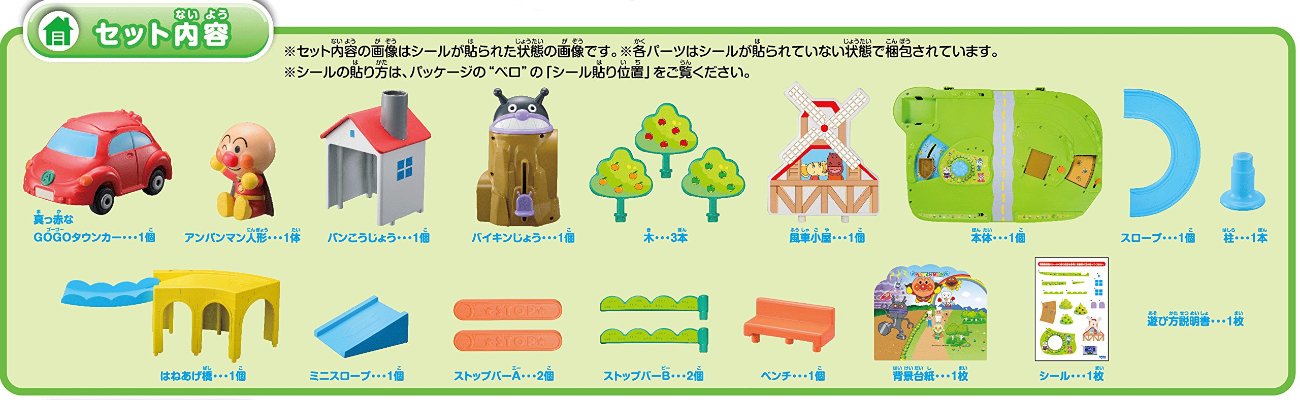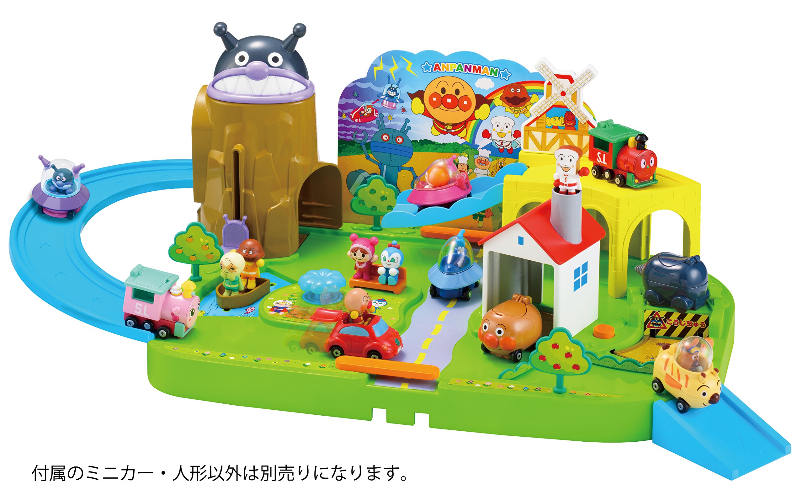 Let's play with Anpanmans in an exciting town filled with lots of pleasant gimmicks! You can run GOGO mini cars (sold separately) or play museum series dolls (sold separately).