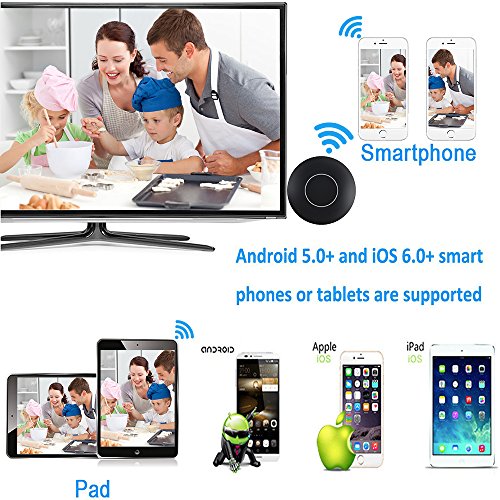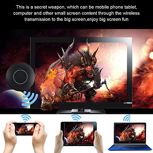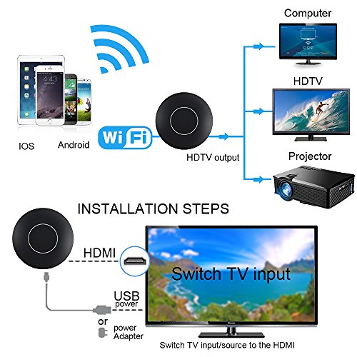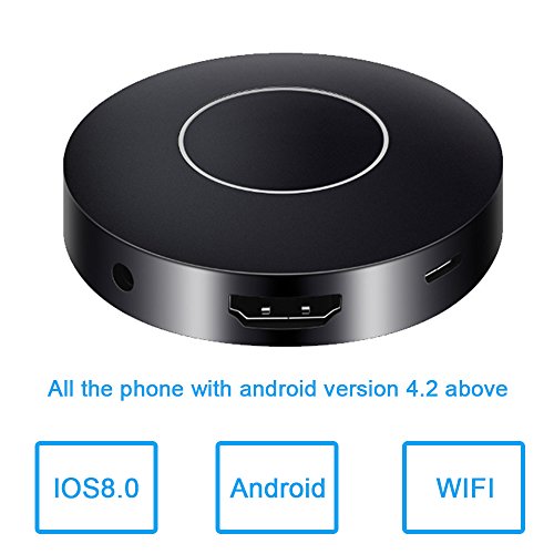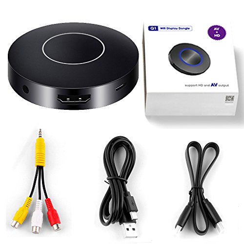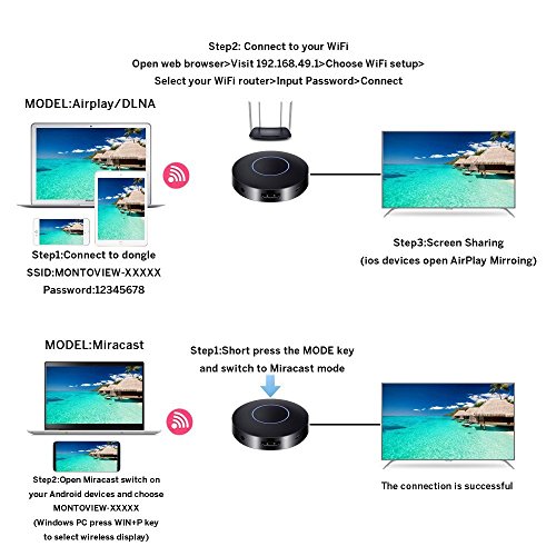 How to Use it: Use the USB cable connect the dongle to the TV's USB port or power adapter for power on, use the HDMI cable connect the dongle HDMI port to the TV's HDMI port. Choose the signal source as HDMI on the TV. For iOS devices: 1.Press the Mode button and switch to DLNA mode for iOS iPhone iPad. 2.Connect iOS device to the dongle WiFi with the password on WiFi setting. 3.Control Center > Airplay Mirroring > Choose dongle, TV will share your screen immediately. 4.When the first use please set the dongle connected to Wi-Fi router. Connect your iOS device to the hotspot of dongle. Open web browser > Visit 192.168.49.1 > Choose Wi-Fi setup > Select your Wi-Fi router > Input password > Connect. For Android devices: 1.Short press the MODE button and switch to MiraCast mode. 2.Open Miracast switch on your Android device and choose MONTOVIEW-XXXXX, the device will automatically connect. 3.After the connection is successful, TV will automatically share your screen. 4.There are different names of Miracast on different Android devices, such as WIFI Display、SmartView、Muti-screen display、WLAN Display、Wireless Display etc. Tips Notices: 1. Online upgrade: If dongle is on network mode, it will upgrade automatically when there is a new version on the dongle; It is compatible with new iOS 11 after the last update. In the case of WiFi stability, the MAX transmission distance can be up to 4 meters. 2.2.Due to the copyright protection (HDCP), public sharing of the contents on the screen may be prohibited by some video service providers (such as Netflix, Amazon video, HULU and other websites). Please double check whether to accept that before purchase. Packing List: 1 * Mirroring Dongle 1 * Micro USB Power Cable 1 * Instructions 1 * AV adapter cable 1 * HDMI cable 0