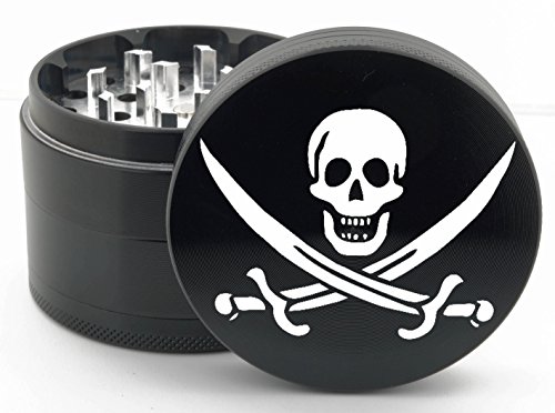Pirate Skull Grinder Black 4 Piece Grinders Premium Grade Metal 2.5" 63mm Grind herbs - Jolly Roger Flag - Gift Box
