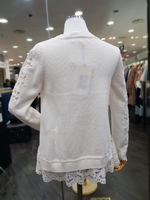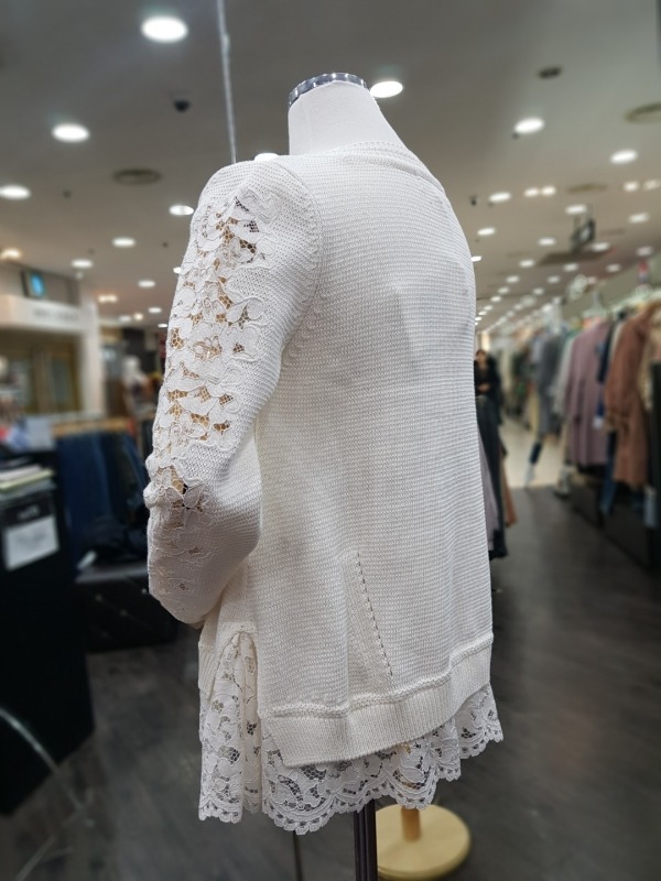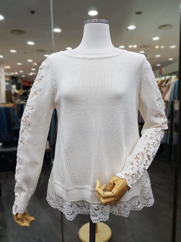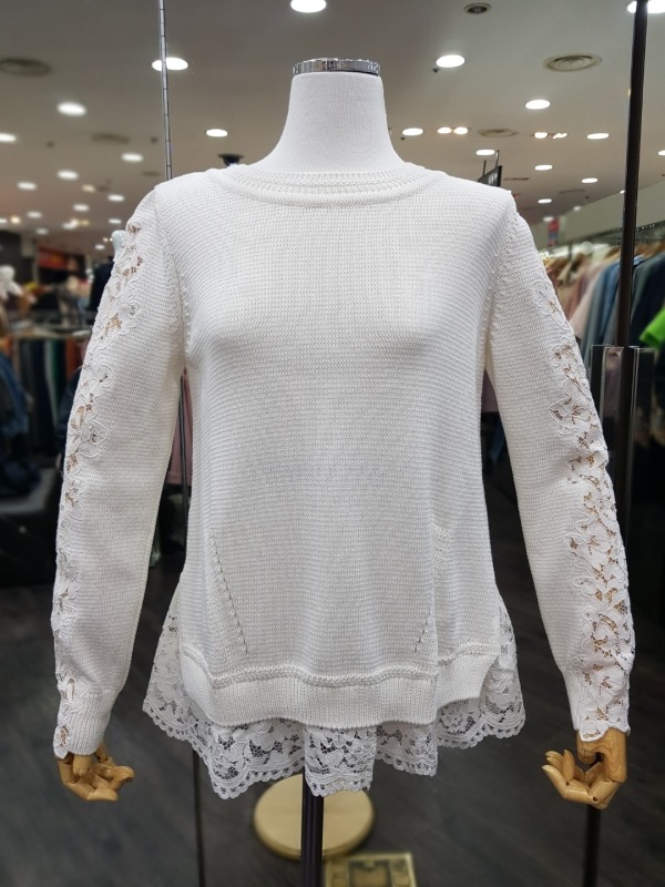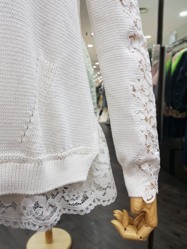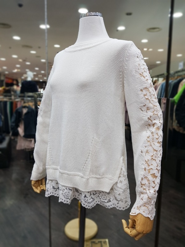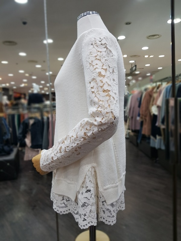 총장61CM정도의 니트로슬리브 측면 및 하단의 레이스 디테일이 돋보이는 크루넥 니트입니다.