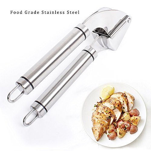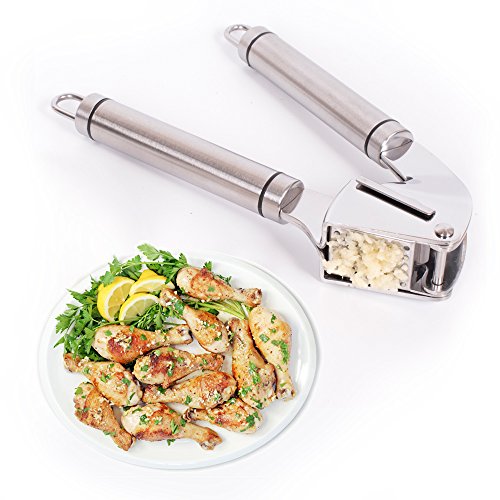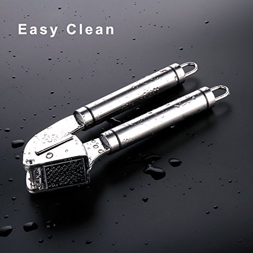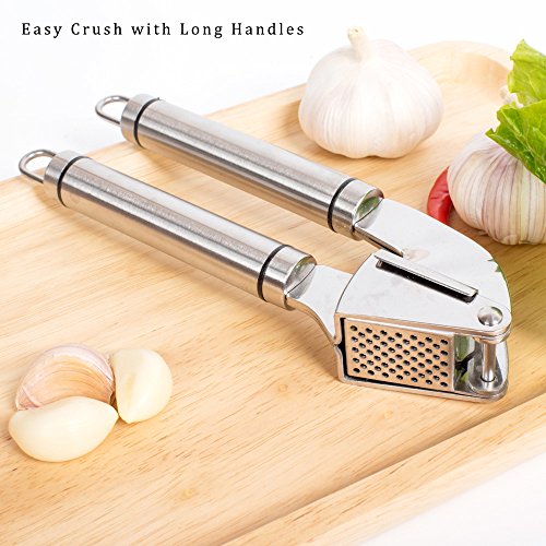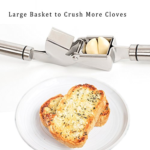 - √ EASY SQUEEZE - Our Garlic Mincer Comes with Long Non-Slip Handles Provide Effortless Leverage, Large Basket Holds More Cloves or Ginger to Crush.