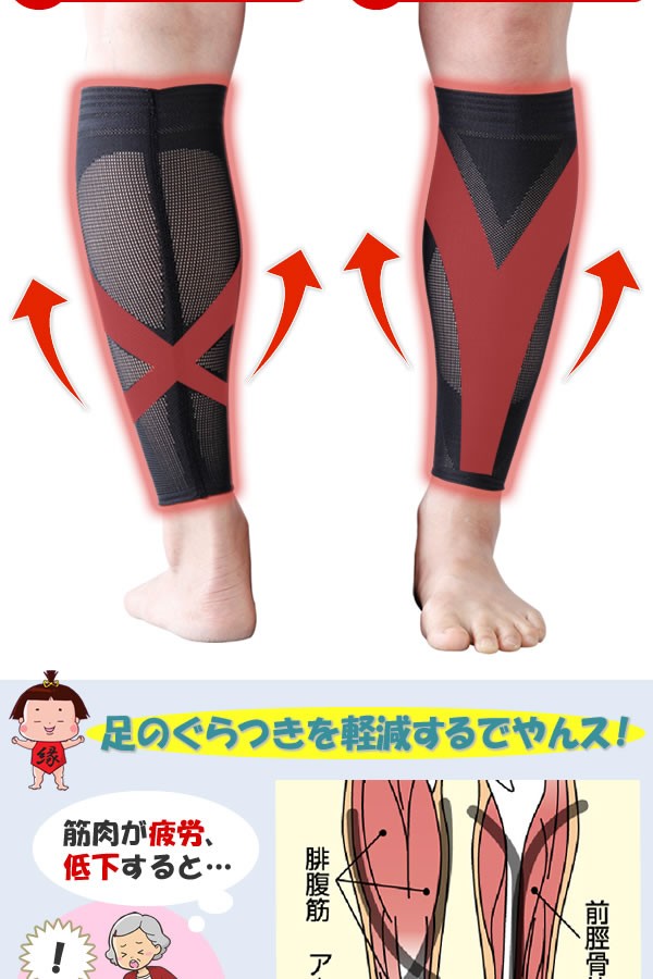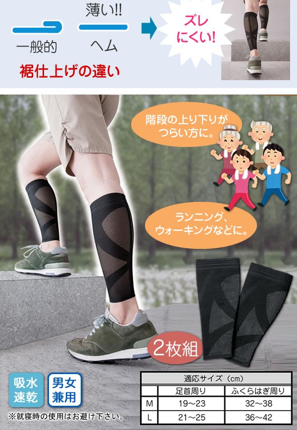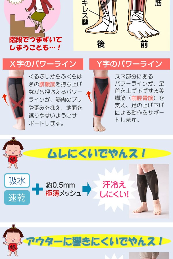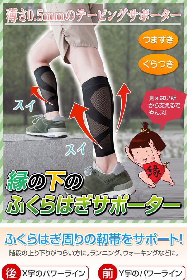 | ちょっとした段差や階段につまずく、足がぐらつく方に、「縁の下のふくらはぎサポーター」!ふくらはぎ周りの靭帯に沿ったパワーラインが筋肉のブレをサポート。吸水速乾生地使用で、極薄約0.5mmだから、吸汗してむれにくい。特殊な編みで薄くてもまるでテーピングのようにしっかり。裾部分が折り返さないヘム仕上げだからアウターにも響きにくい。サポーターの裾に向けて着圧が弱くなるからズレにくい!階段の上り下り、ランニング、ゴルフ、ウォーキング、山登り、ハイキング、スポーツや運動などに。男女兼用。左右兼用。日本製。メンズ/レディース/長時間の立ち仕事/むくみ対策/エコノミー症候群/ |