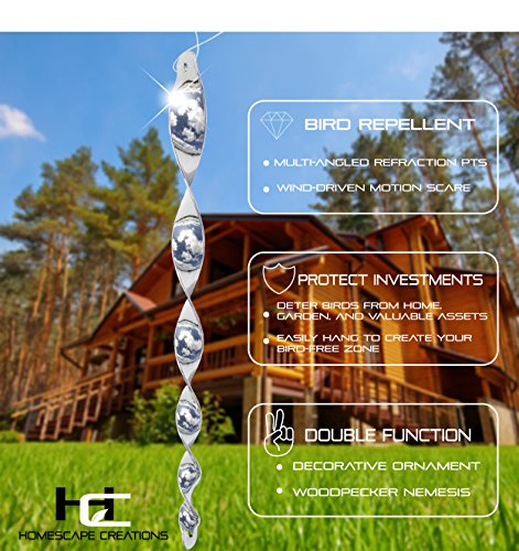 - HIGHLY EFFECTIVE – Upgraded 15 inch size for a bolder and more prominent bird-scare look. Multiple angles of refraction points combined with wind motion to scare, confuse, and prohibit woodpeckers and other birds from adapting to environment. A disc, tape, and decal alternative. *Note - For best results, please use with direct sunlight and a breeze.