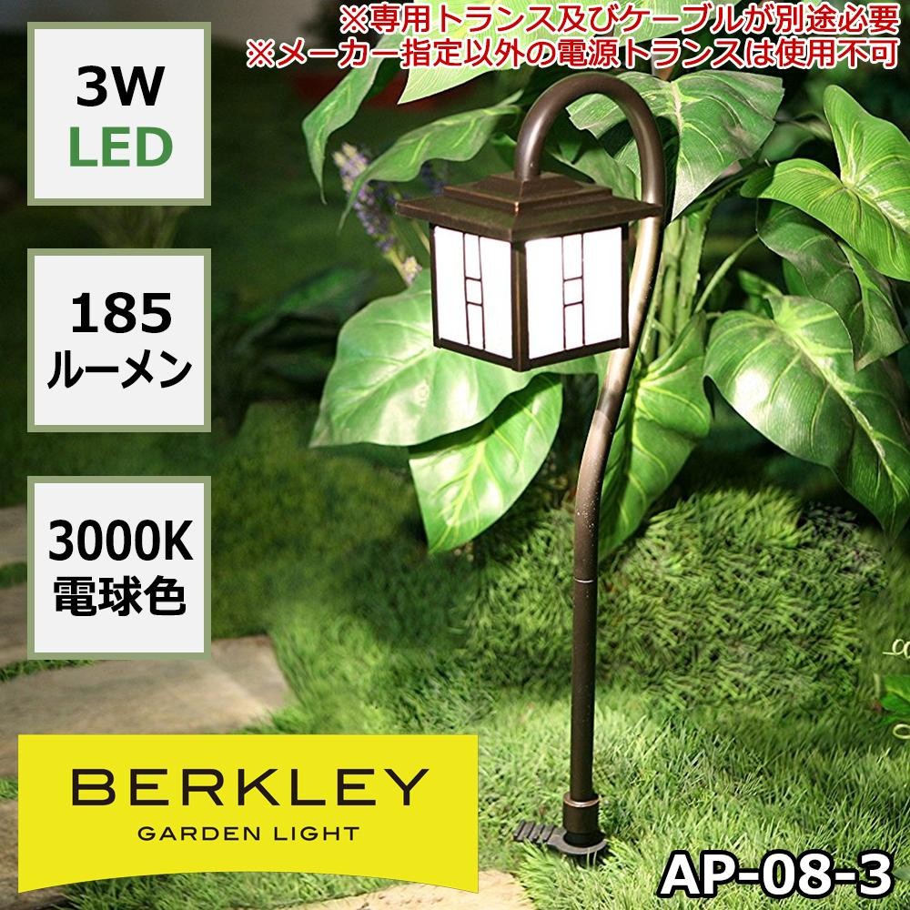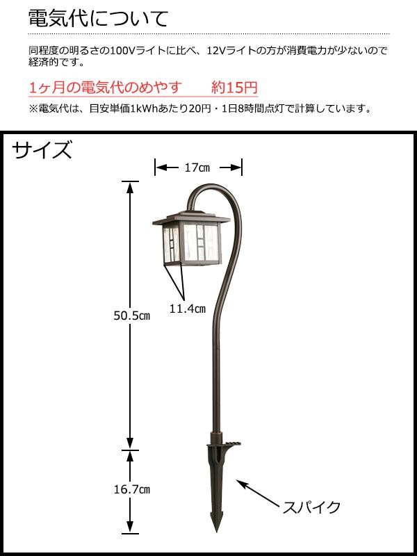 | 仕様 | 3WLED 色温度:3000K(電球色) 全光束:185ルーメン 電圧:12V 定格寿命:約40000時間 ブロンズ色 防雨型 LED交換不可 専用トランス及びケーブルが別途必要 メーカー指定以外の電源トランスは使用不可 |