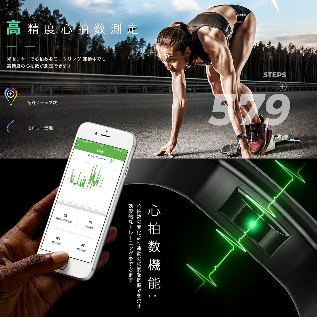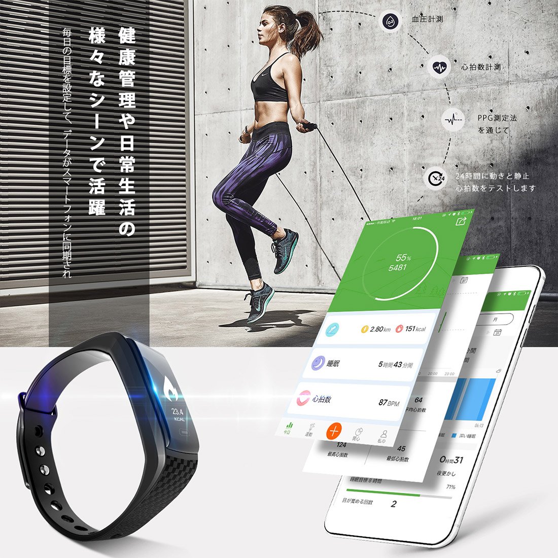 [Display health index] You can clearly display time, date, step count, distance, calorie, heart rate, blood pressure on the OLED display.