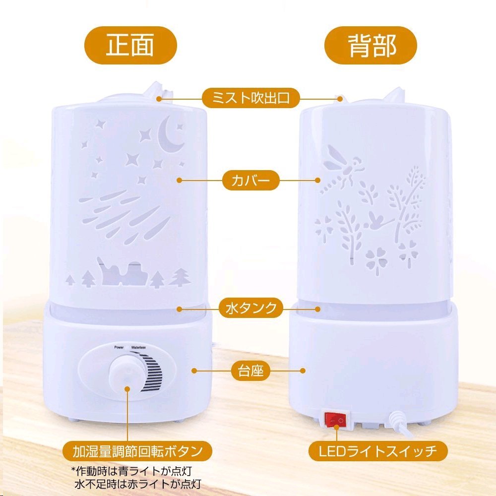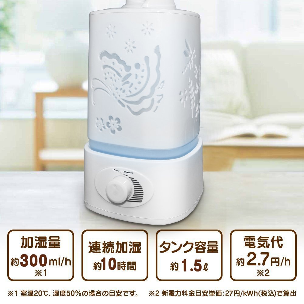 Ultrasonic humidifier which vibrates the water put in the tank and releases fine water particles into the air.