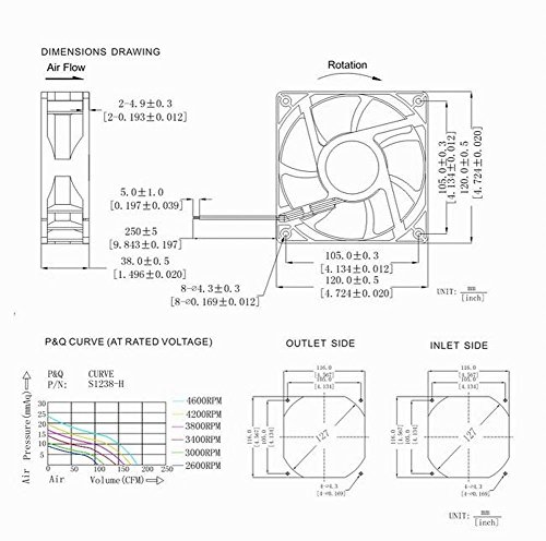 -. Feature : Package include: 1x fan ,1x grill / Rated Power:DC 12V 0.5 Amp, Bearing type:Sleeve / Speed:2800RPM Air flow:118 CFM Noise:42dBA / Connecter:XH2.54-2Pin, Cable Length:25cm Or 9.5 inches / Size:120x120x38mm or 4.7x4.7x1.5 inches Weight:230g/pcs