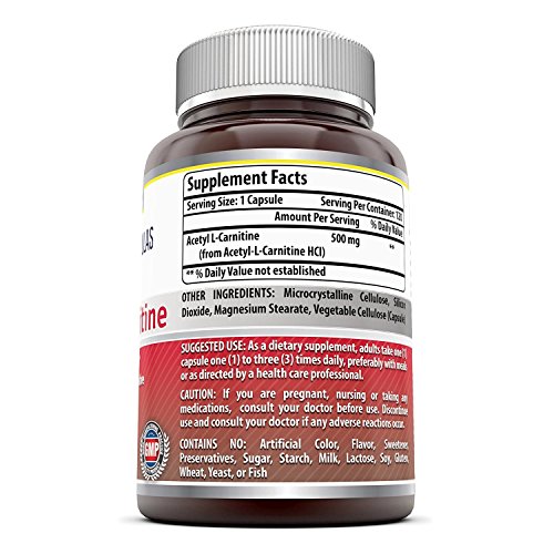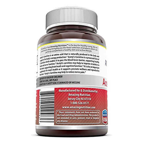 -. Feature : BOOST ENERGY THE NATURAL WAY As a mitochondrial energy optimizer, carnitine helps to support energy production at the cellular level. Unlike energy tablets, energy drinks and energy pills that contain harsh stimulants, l carnitine supports healthy energy levels without all the jitteriness and side effects / THE BEST FORM OF CARNITINE Each l carnitine 500mg supplement provides you with a potent dose of acetyl l carnitine HCl. In clinical studies, acetyl l carnitine or acytl l carnitine has been shown to cross the blood-brain barrier more readily than other forms to provide enhanced brain health and cognitive support / JUST ONE VEGGIE CAPSULE PER DAY Why swallow countless pills or down drink after drink to stay energized? Just one acetyl carnitine veggie capsule is all that's needed to supply your body with the fuel to keep you going / QUALITY ASSURED Amazing Nutrition supplements are manufactured in a GMP-certified facility in the United States for purity and safety. No artificial colors, flavors, sweeteners and preservatives are added / IDEAL FOR ALL DIETS Vegetarian friendly capsules are free of sugar, starch, milk, lactose, soy, gluten, wheat, yeast, fish and sodium to complement all healthy diets
