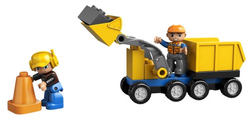Vehicles include DUPLO truck, crane and front loader.