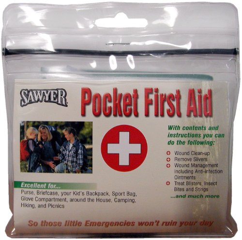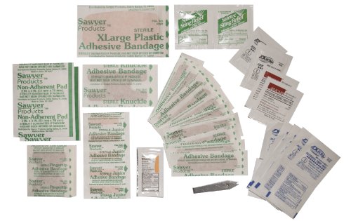 A first aid kit for your purse, briefcase, your kid's backpack, sport bag, car glove compartment, around the house, camping, hiking, and picnics. Contents include: WOUND CLEANING/DISINFECTION: Alcohol Pad- 5 each, Sting Care Pad- 2 each, Antiseptic Wipe- 2 each, PVP Iodine Wipe- 2 each, Ointment- 1 each. WOUND PROTECTION: 2-inch by 3-inch Gauze Pad- 2 each, Extra Large Bandage- 1 each, Knuckle Bandage- 1 each, Fingertip Bandage- 1 each, Mini/Junior Bandage (1 Strip of 5)- 5 each, Standard 3/4-inch Bandage- 10 each. SPECIALTY ITEMS: Tweezer- 1 each.Feature