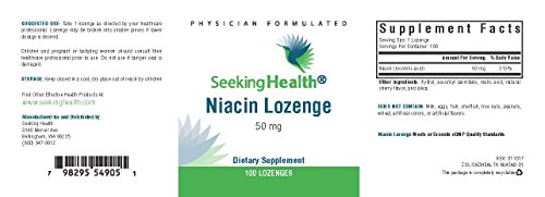 -. Binding : Health and Beauty -. Brand : Seeking Health -. EAN : 0798295549051 -. Feature : IMPORTANT: Niacin Lozenge is manufactured for and sold exclusively by Seeking Health. We DO NOT recommend purchasing this product from any supplier other than Seeking Health on Amazon.com. / Provides 50 mg of Niacin (as nicotinic acid) in an easy-to-deliver lozenge. / Promotes healthy skin and is important for energy production. May also support healthy mood and cognitive health. / Natural Cherry Flavor. Free of Magnesium Stearate. Non-GMO ingredients. / Physician Formulated. -. IsAdultProduct : 0 -. Label : Seeking Health -. Manufacturer : Seeking Health -. MPN : NIACIN-100-LOZ -. PackageQuantity : 1 -. PartNumber : NIACIN-100-LOZ -. ProductGroup : Health and Beauty -. ProductTypeName : HEALTH_PERSONAL_CARE -. Publisher : Seeking Health -. Studio : Seeking Health -. Title : Niacin Lozenge | Provides 50 mg of Niacin in easy-to-deliver lozenge | Vitamin B3 | Free of Magnesium Stearate | Non-GMO | Natural Cherry Flavor | Physician Formulated | 100 Lozenges | Seeking Health -. UPC : 798295549051
