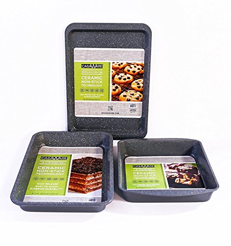 - Includes a 10” x 14” Cookie/Jelly Roll Pan, a 9” x 13” Rectangular Cake Pan and Square 9” x 2” Baking/Cake Pan