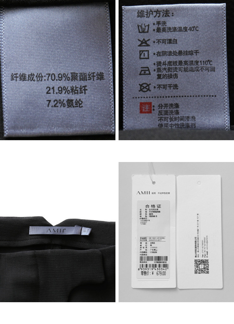 | 面料成分: | 70.9%聚酯纤维、21.9%粘纤、7.2%氨纶 |