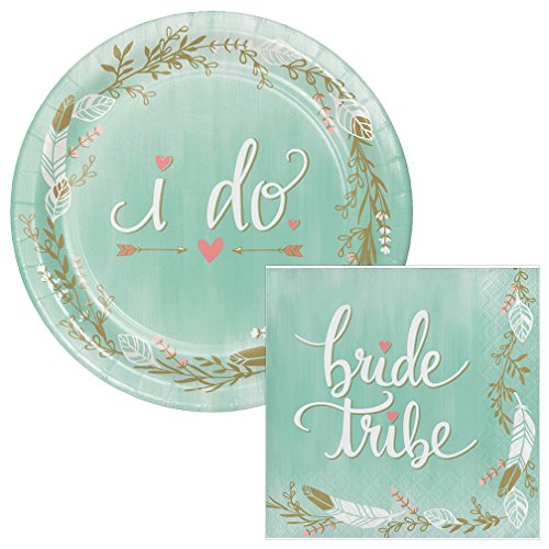 - Plates feature a floral design & say: "I do" with heart accents & napkins say: "Bride Tribe"