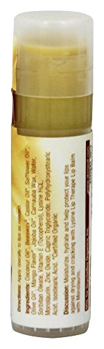 Other Ingredients: Coconut Oil*, Beeswax*, Castor Oil*, Safflower Oil*, Olive Oil*, Mango Flavor*, Jojoba Oil*, Carnauba Wax, Water, Sorbitan Oleate, Vitamin E (Tocopherol), Lysine HCL, Monolaurin*, Zinc Oxide, Capric Triglyceride, Polyhydroxystearic Acid, Isosteric Acid. *Certified Organic