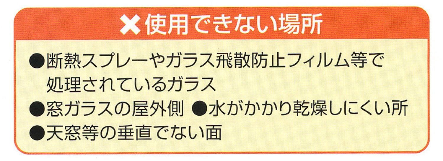 断熱スプレーやガラス飛散防止フィルム等で処理されているガラス、窓ガラスの屋外側、水がかかり乾燥しにくい所、天窓等の垂直でない面についても使用不可